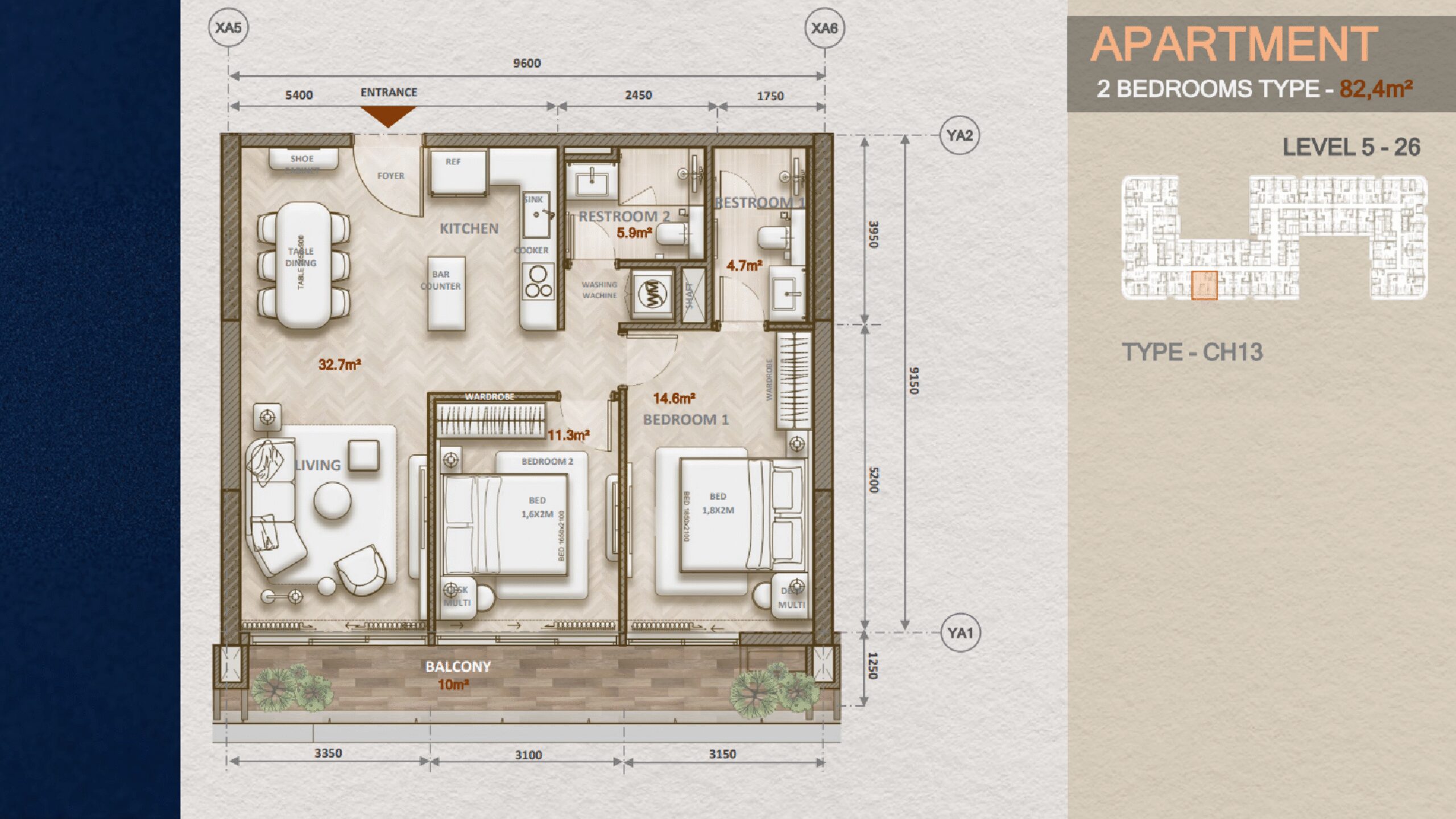 Thiết kế: Gồm 2 phòng ngủ, phòng khách, bếp, 2 phòng tắm và ban công.