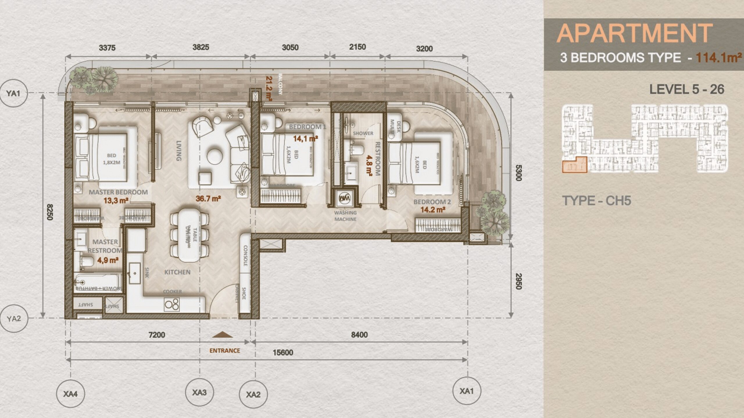 Thiết kế: Gồm 3 phòng ngủ, phòng khách rộng rãi, bếp, 2-3 phòng tắm và ban công lớn.