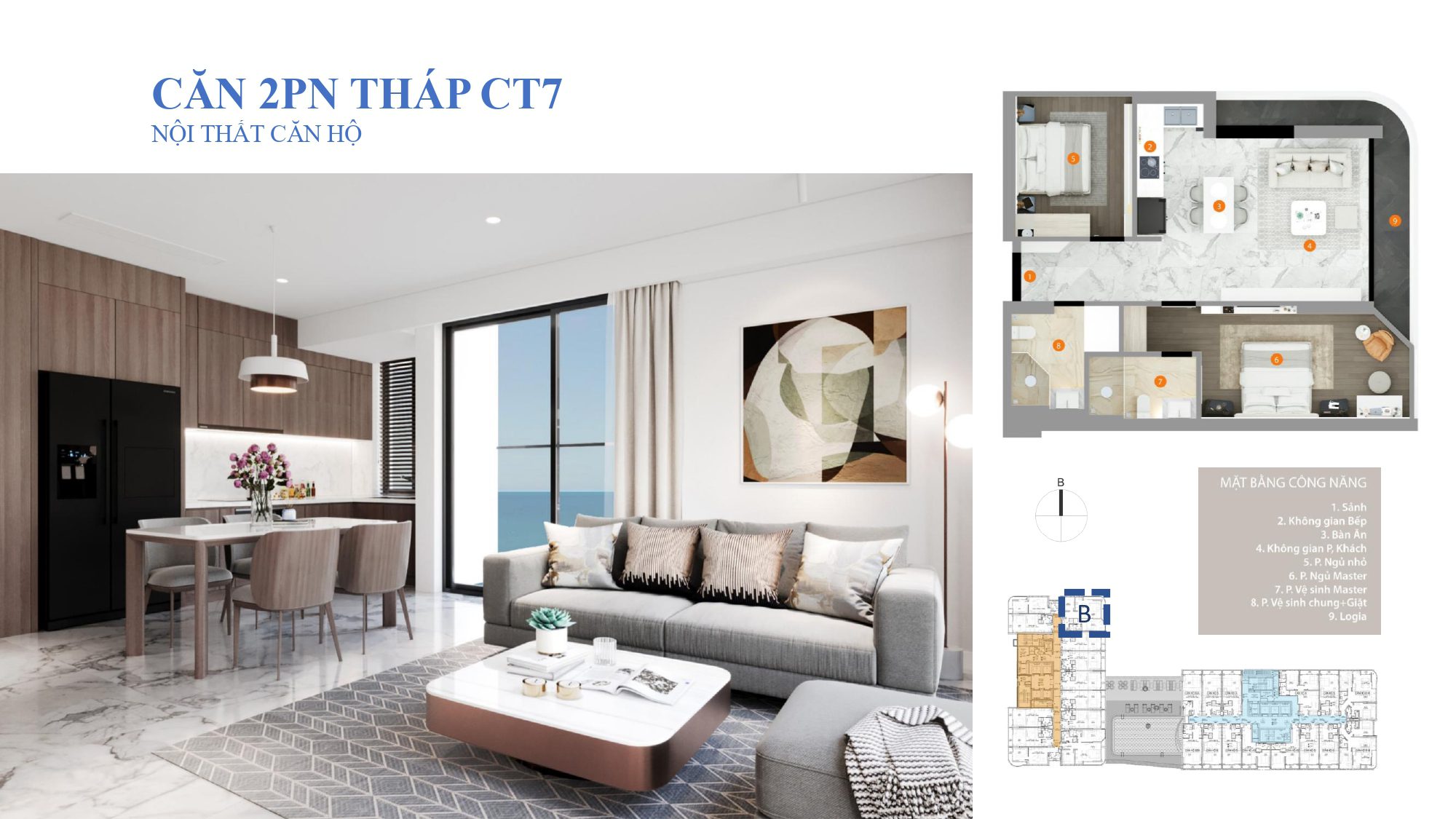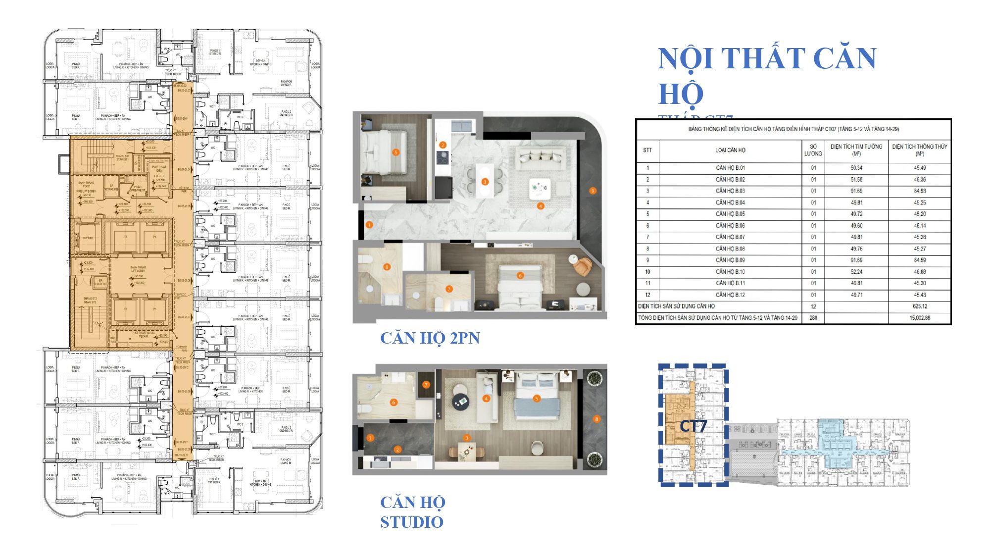 Tòa CT7 có cơ cấu 66% là căn studio và 17% là căn 1 phòng ngủ, còn lại 16% là căn 2 phòng ngủ và 1% là căn 3 phòng ngủ.