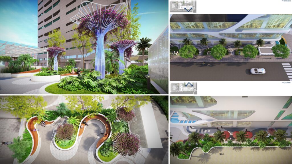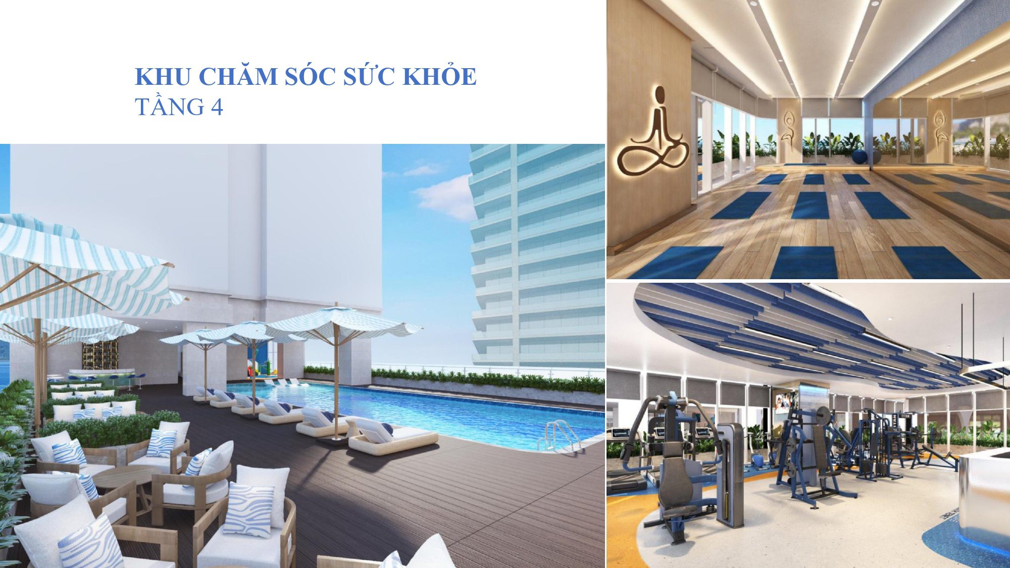 - Tầng 4: Khu bể bơi 208m2, Gym, Spa, sân vườn ngoài trời (cao 6,5m)