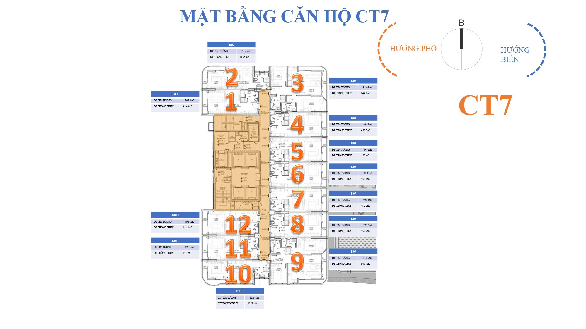 - Tầng căn hộ tòa CT7: từ tầng 5 – tầng 23 bao gồm 12 căn/sàn – 5 thang máy, DT: 45,4 – 54,8 (góc *2c) – 96,3 m2 (góc *2c)